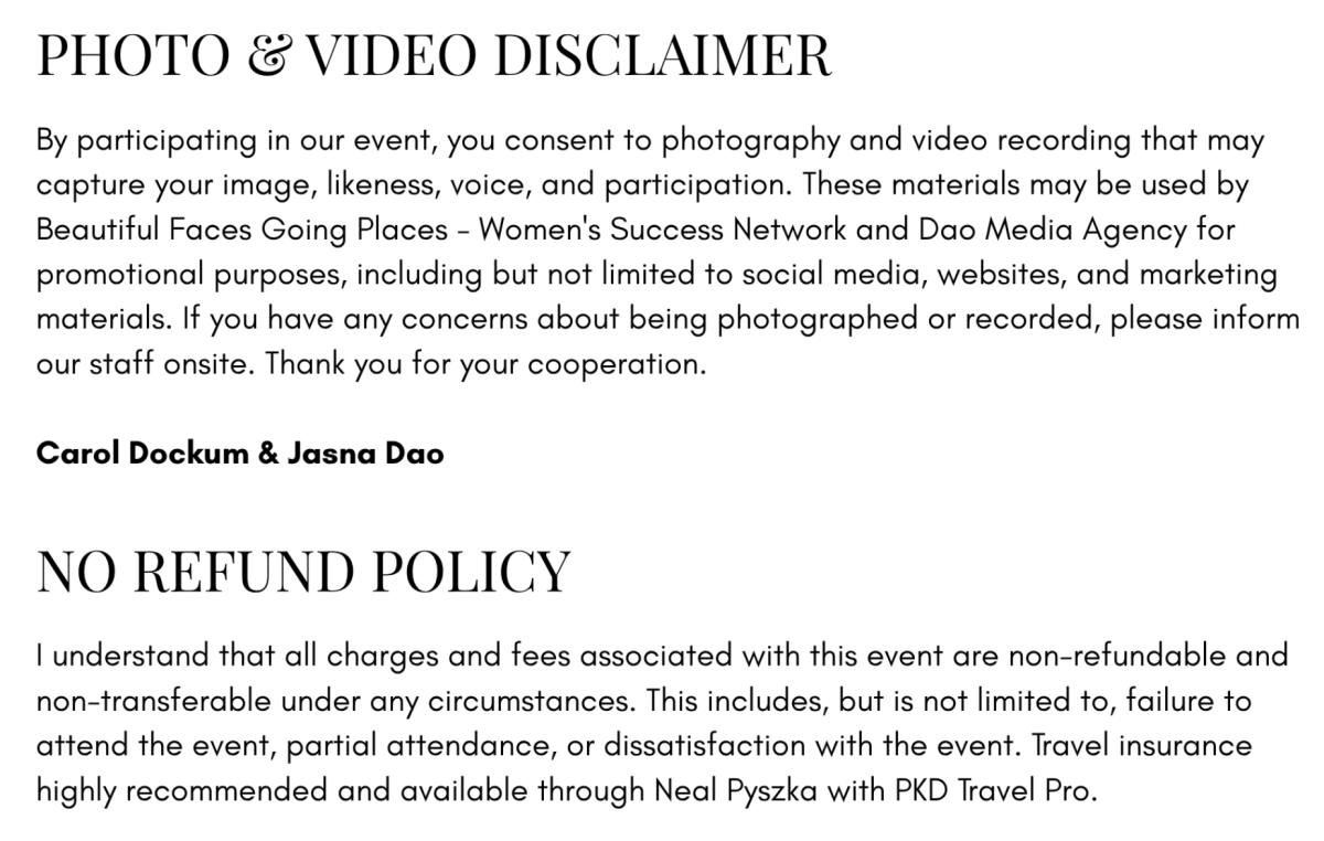 Photo and Video Disclaimer: By participating in our event, you consent to photography and video recording that may capture your image, likeness, voice, and participation. These materials may be used by Beautiful Faces Going Places and Dao Media Agency for promotional purposes, including but not limited to social media, websites, and marketing materials. If you have any concerns about being photographed or recorded, please inform our
